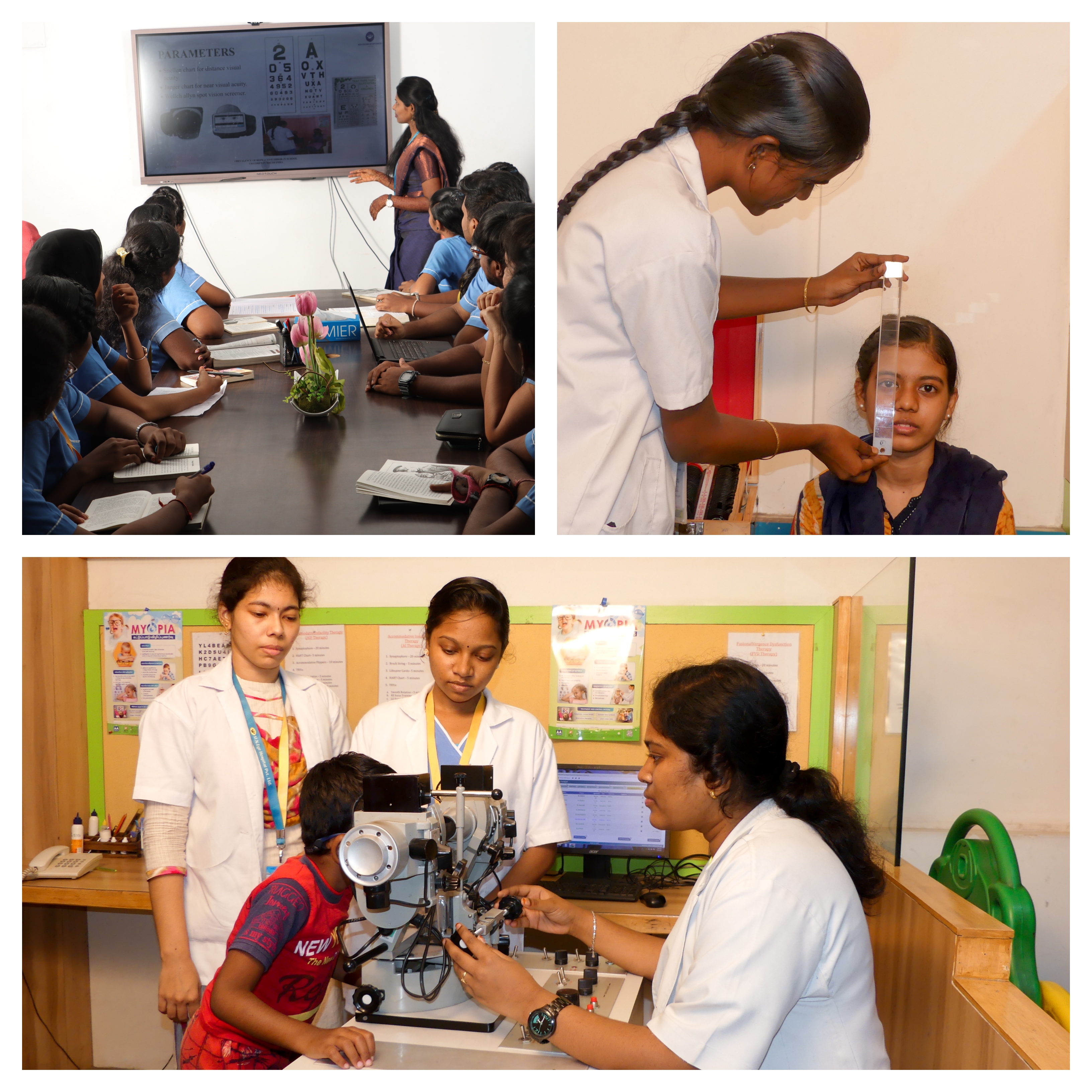 - All students rotate through and work with patients in all speciality clinics like Refraction, Contact Lenses, Squint and Orthoptics, Glaucoma and Field charting, Low vision and Optical Dispensing.